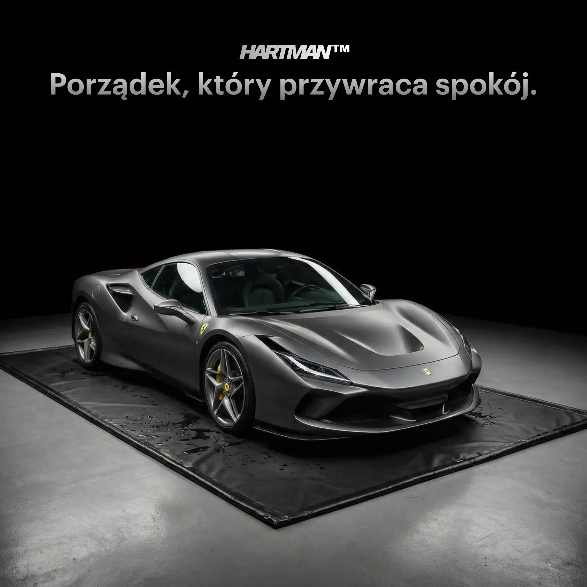 Mata Hartman porządkuje przestrzeń wokół auta, tworząc suchą i profesjonalną strefę pracy o wymiarach 6,1 × 3,0 m. Gramatura 778 gsm zatrzymuje wodę i detergenty, zabezpiecza podłoże i umożliwia legalne mycie samochodu tam, gdzie tego potrzebujesz.